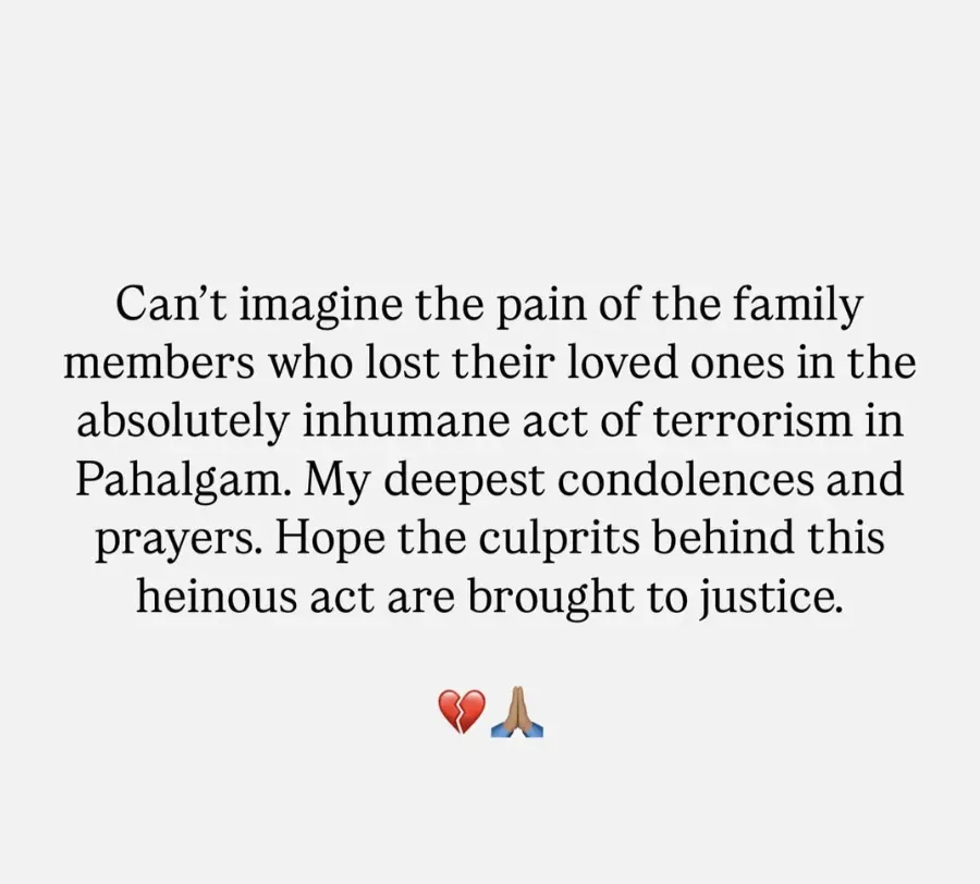 अनुष्का शर्मा ने इंस्टाग्राम स्टोरी पर लिखा, "कश्मीर के पहलगाम में निर्दोष लोगों पर हुए निर्मम आतंकी हमले के बारे में सुनकर दिल टूट गया। उनके परिवारों के लिए मेरी प्रार्थना और संवेदना।"